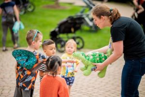 All children’s staff, both associates and librarians, do programming at the Naperville Public Library. At the Nichols Library location, the outdoor storytimes are presented by 3 to 4 staff each week, plus a supervisor who oversees audio and crowd control. Crowds are bigger for the outdoor events and when choosing material, staff thinks about making sure the crowd can see and participate in the story. Monica tells us they use large props outside. Again, these are unveiled to the public at the time they are presented!