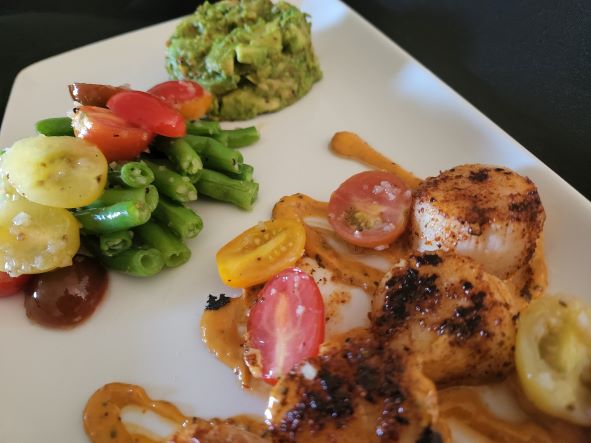 Chef Terrell Cole of Dark Horse Catering shows us how to make his Brûléed sea scallops, with fresh green beans and smokey guacamole finished with grape tomatoes!