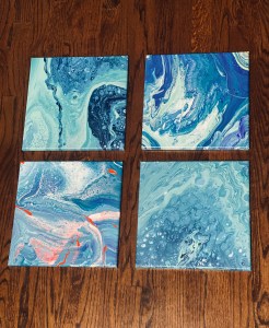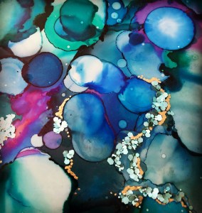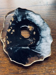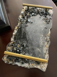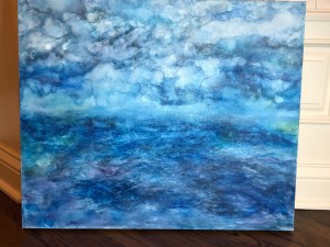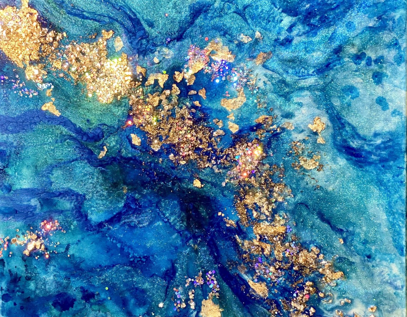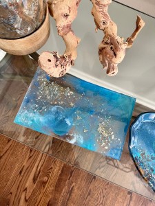 My business/studio name is The Carpenter’s Daughter. My style is organic, abstract and fluid – using both learned and instinctual techniques, I create with materials like resin, acrylic paint and pigments along with naturally occurring elements such as minerals, rocks, metals, glass, mica, sand to best express my feelings of connectedness and love to the Earth and ocean.