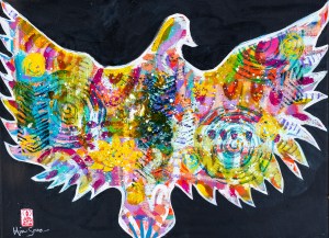 My studio name is Aqua Love Studio. I’m all about using my art for a positive impact! I mainly work in watercolor, acrylic and collage.