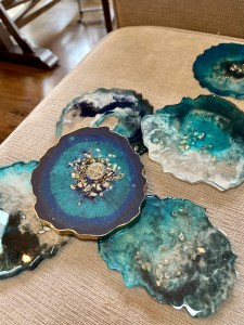 My business/studio name is The Carpenter’s Daughter. My style is organic, abstract and fluid – using both learned and instinctual techniques, I create with materials like resin, acrylic paint and pigments along with naturally occurring elements such as minerals, rocks, metals, glass, mica, sand to best express my feelings of connectedness and love to the Earth and ocean.Greg Mulvey