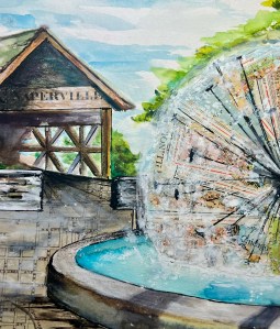 “Dandelion Fountain” (on the cover) is a mixed media piece using ink, watercolor, acrylic and vintage Naperville and Illinois maps.